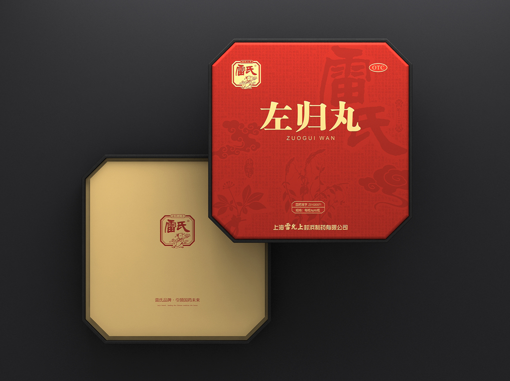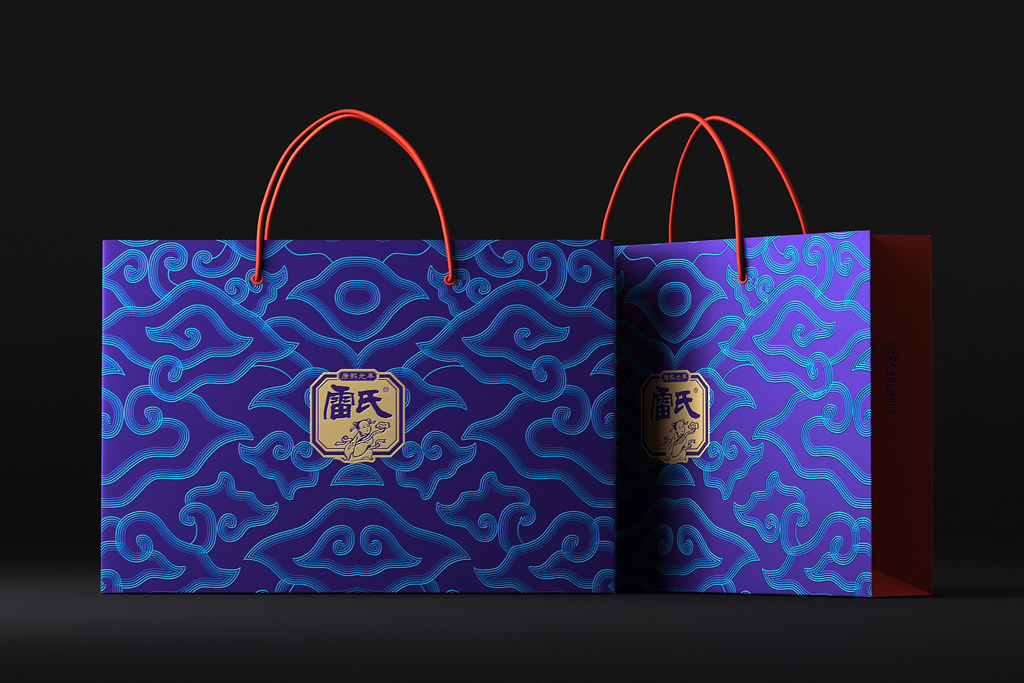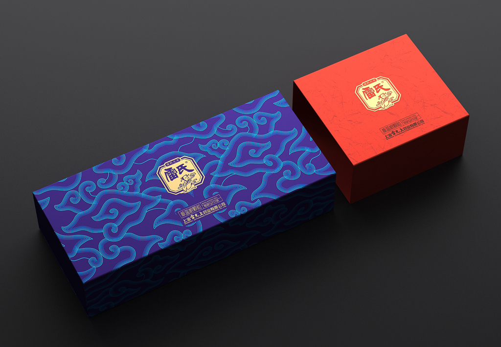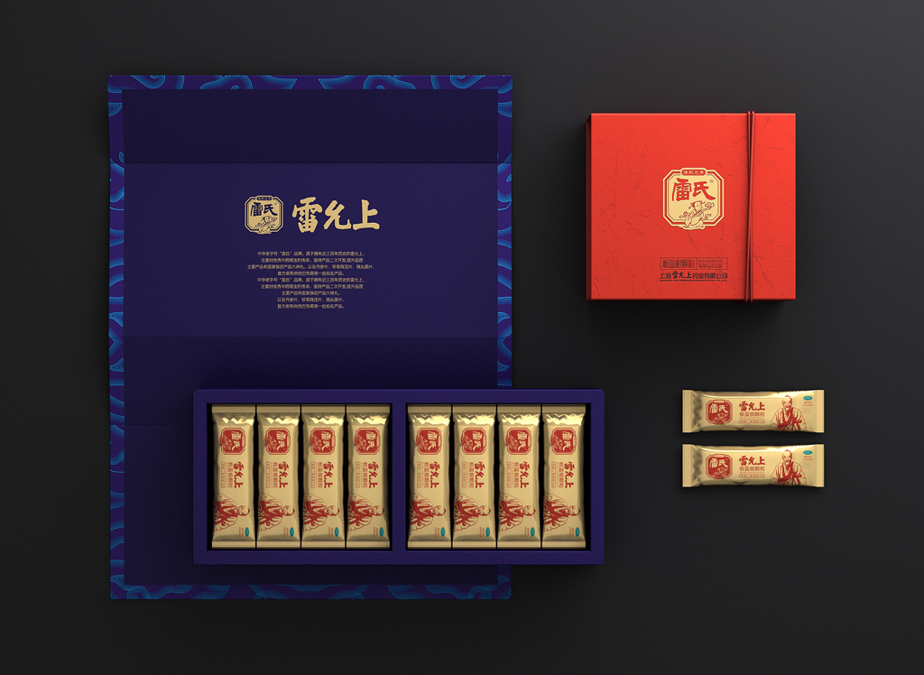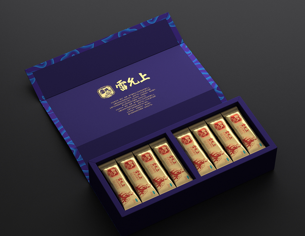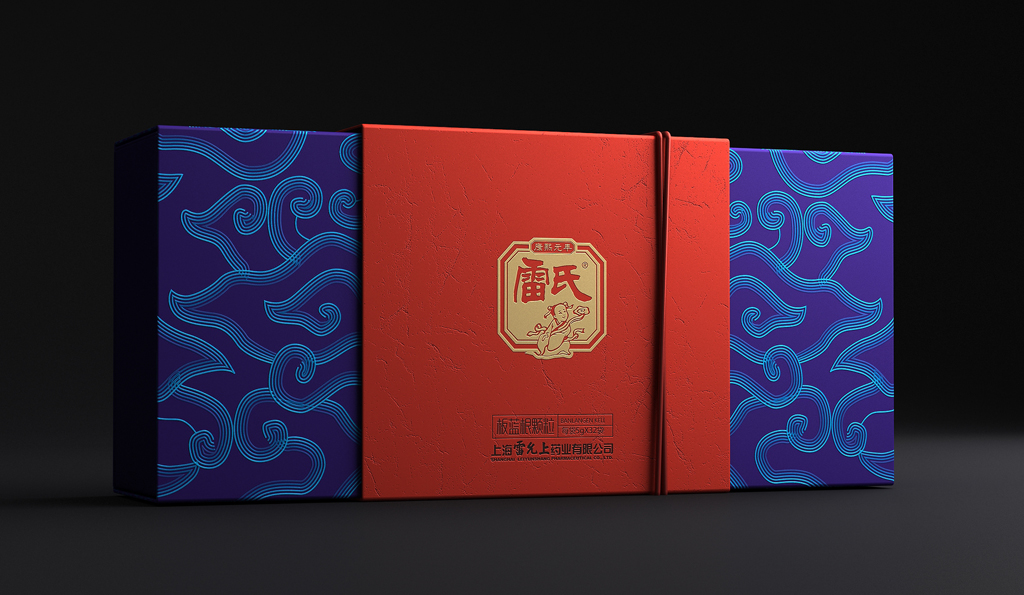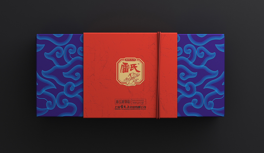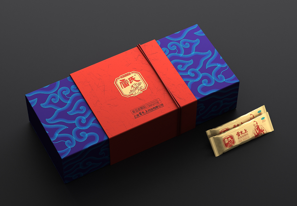 设计键词:简约创新盒形、民俗元素及色彩、视觉形象鲜明袋装采用视觉上更美观与开口更方便的背封袋,从一定程度上弱化“药品”的感觉。金色具有极强的品质感,与红色搭配礼品感十足。用雷允上的形象作为主要的识别符号,以体现企业品牌悠久历史的“传统老字号”形象。外盒开盒形式源自传统的中药麻绳打包形式,将绳子概念融入现代设计手法的包装中,是传统与现代结合的“新古典”创意手法。以体现企业中医药文化的传承与创新。色彩以蓝色搭配红色是经典配色,具有浓厚的民俗味,红色又为喜庆、吉祥的颜色,适合礼品用途。图案以现代的中式祥云、代表着吉祥、如意、祥瑞,用此图案作为包装纹样,礼品适用场合广泛。