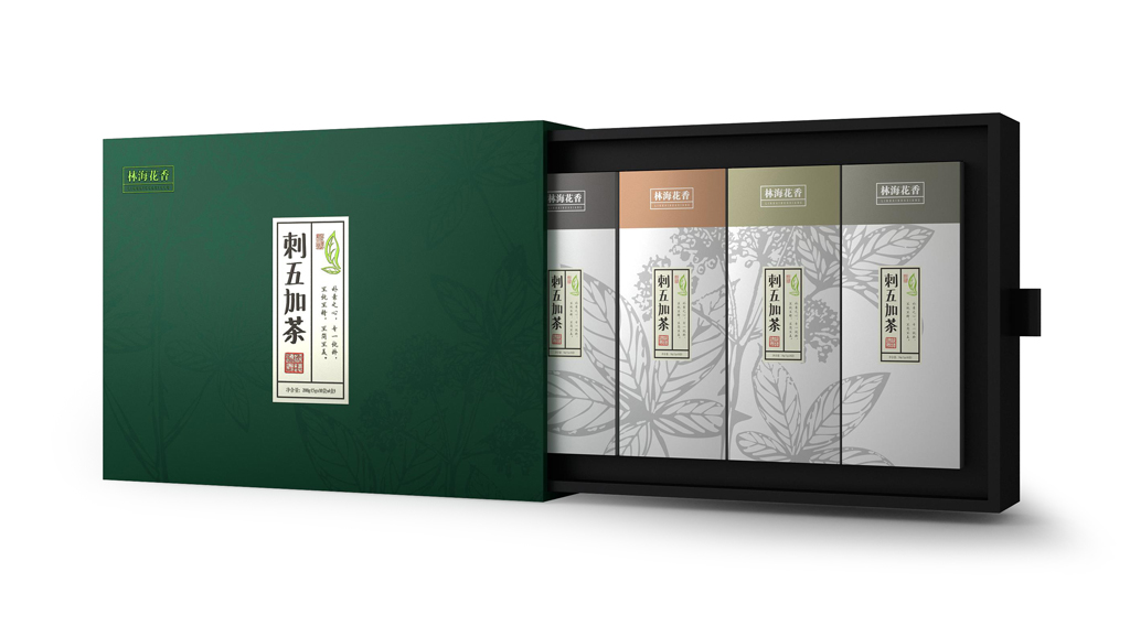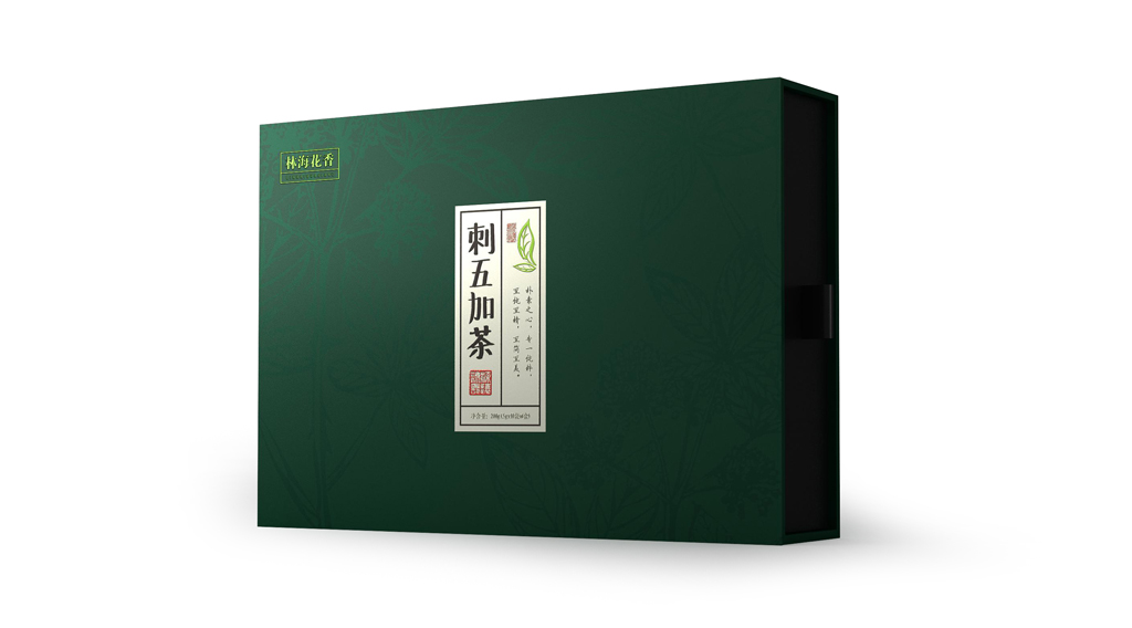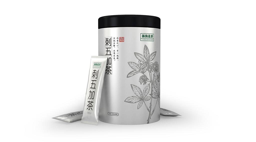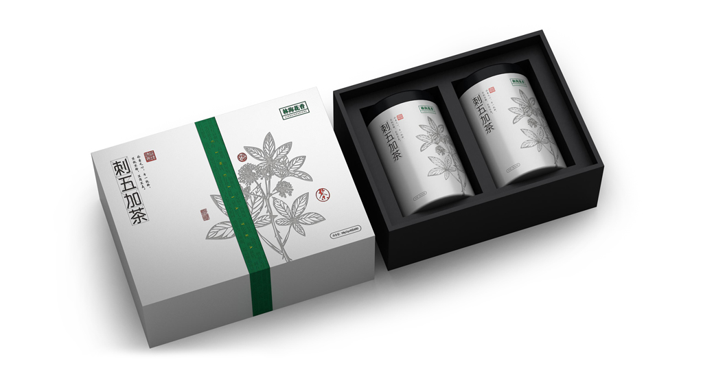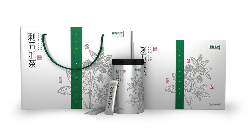 以原生态刺五加茶图形为基础,展现自然姿态,简经明了,体现茶的自然韵味。